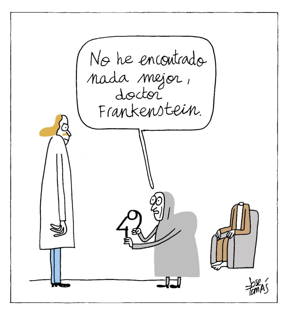 Frankenstein de Jose Tomás FacebookTwitterWhatsAppEmail FacebookTwitterWhatsAppEmail Jose TomásHumorista gráfico e ilustrador. DEJA UNA RESPUESTA Cancelar respuesta Comentario: Por favor ingrese su comentario! Nombre: Por favor ingrese su nombre aquí Correo electrónico: ¡Has introducido una dirección de correo electrónico incorrecta! Por favor ingrese su dirección de correo electrónico aquí Sitio web: Guardar mi nombre, correo electrónico y sitio web en este navegador la próxima vez que comente. Δ Artículo anteriorEl tercer molar de mi maxilar superiorArtículo siguienteMatización a mis conclusiones finales en el XXI Congreso Internacional sobre los Efectos del Estrés en la Personalidad y los Beneficios del Autocontrol Más cosas Se vende octubre 19, 2025 Soy la hormiga Trancas y estoy al borde de una crisis nerviosa porque tengo que ganar el próximo Premio Planeta octubre 19, 2025 A quien quiera que lea esto, soy Trancas, una de las entrañables hormigas de «El Hormiguero» y escribo estas líneas para que quede constancia... Zebras ardiendo octubre 12, 2025 Per la secció d’esports octubre 12, 2025